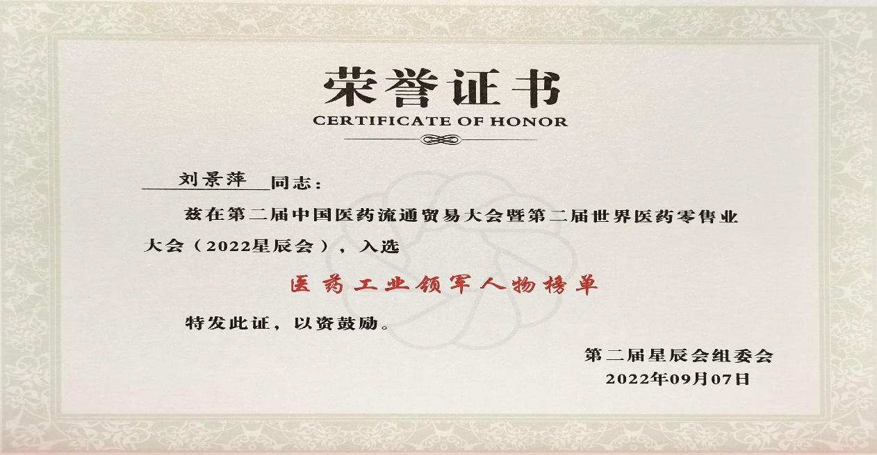 本次星辰会期间,ks凯时斩获颇丰,获得多项行业奖项及荣誉。在开幕式上,刘景萍董事长荣获“医药工业领军人物”称号。